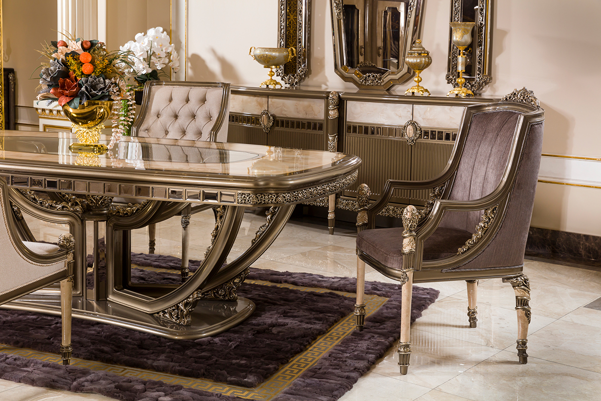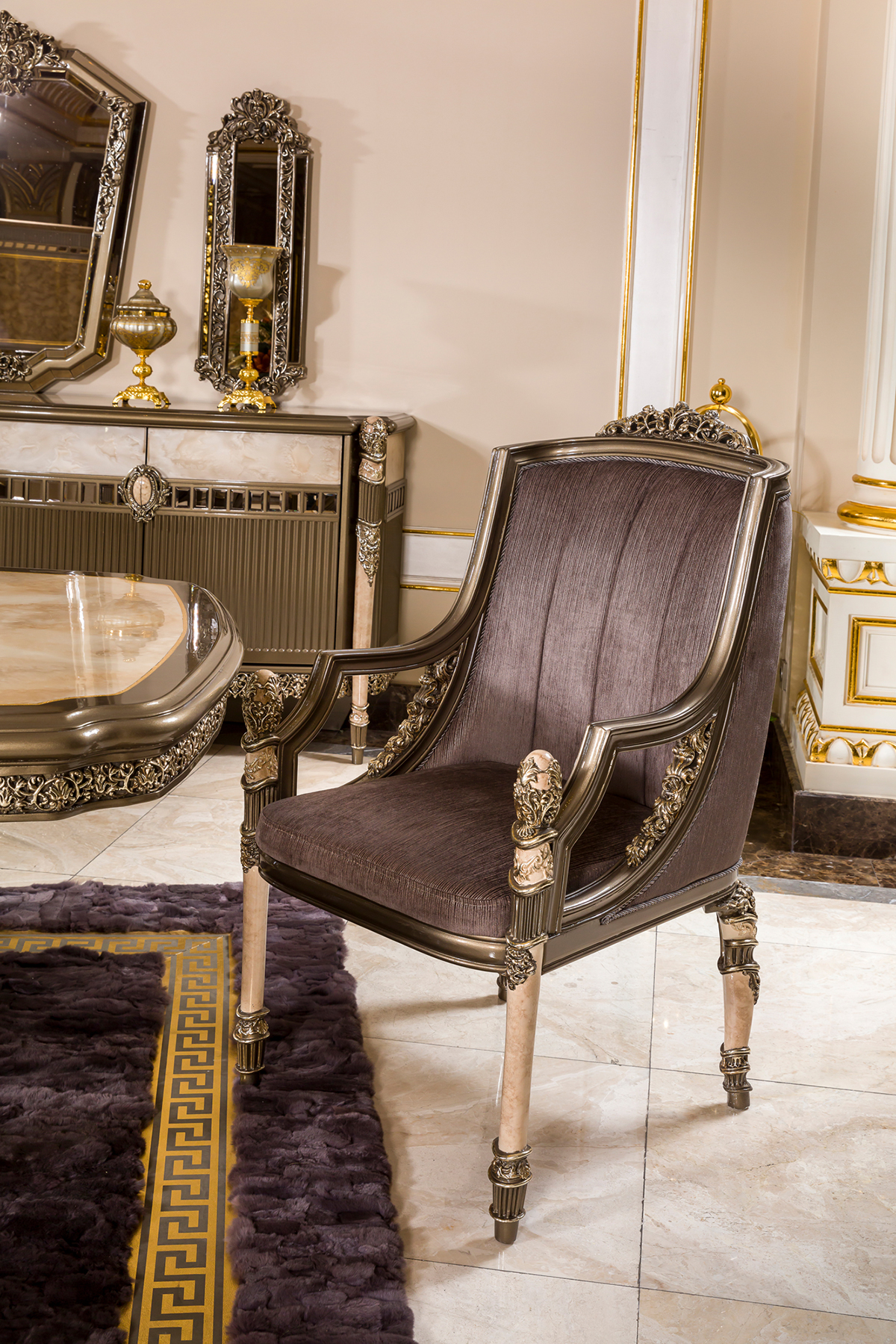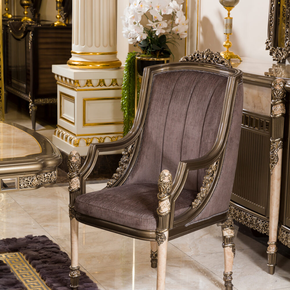 As a product of custom production, the Perla Classic Chair is crafted with intricate details, premium upholstery, and exquisite woodwork. Designed by a Turkish custom furniture producer, this chair enhances any classic dining room or luxurious living space, offering a regal touch to interiors with its timeless charm.