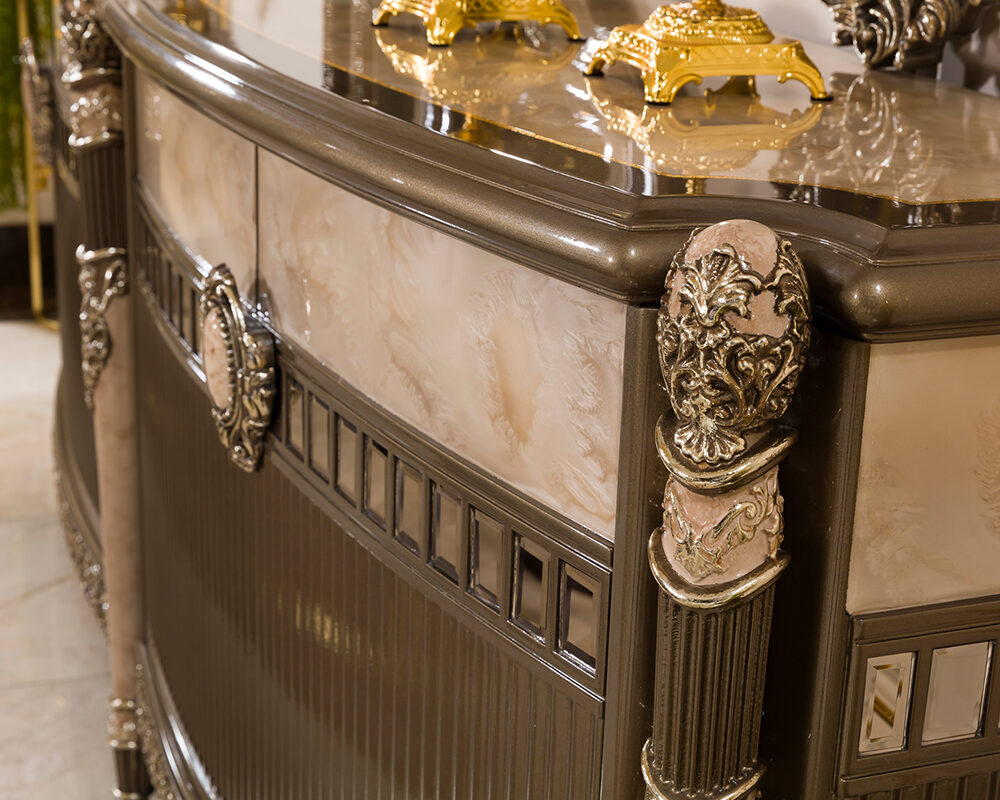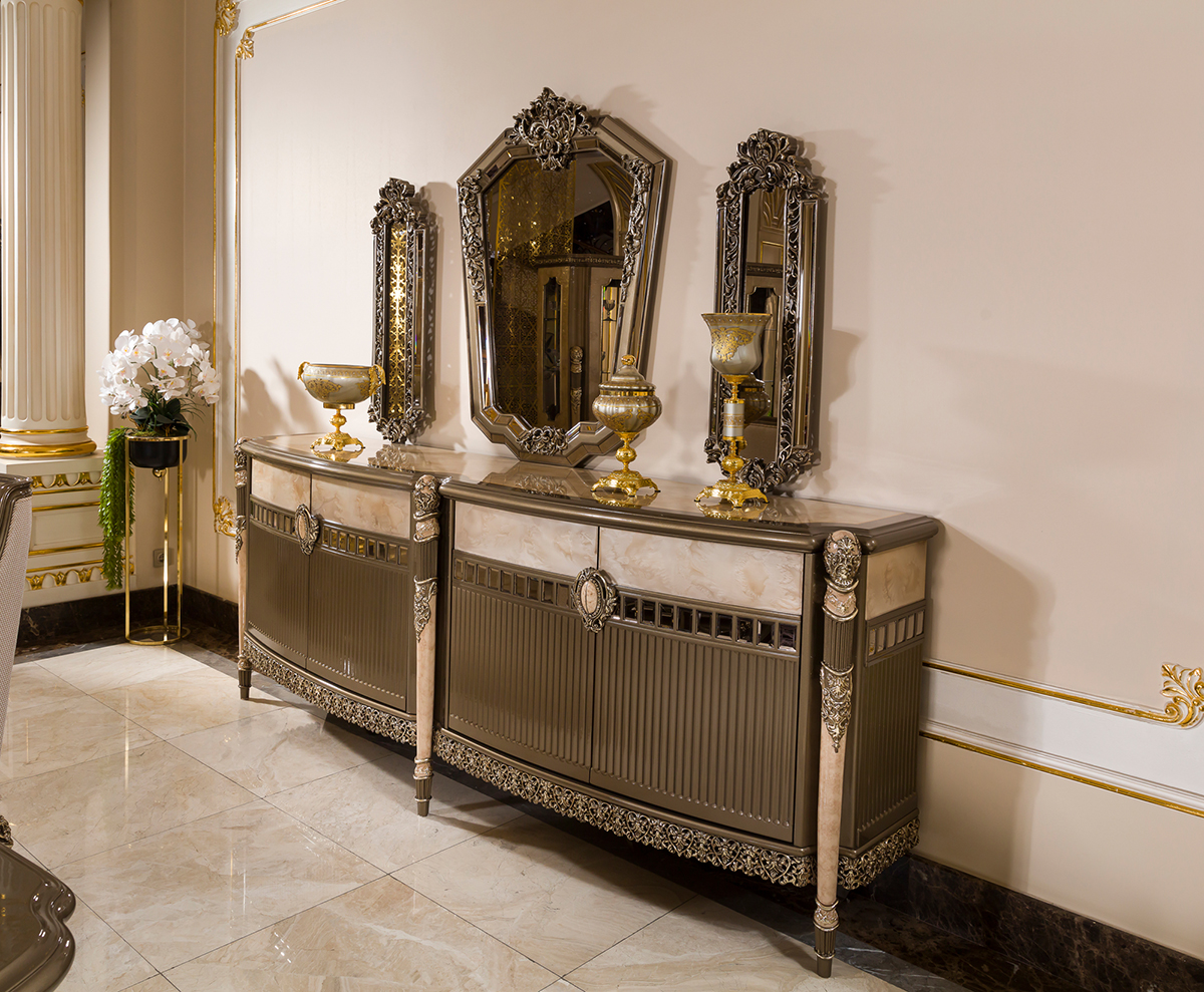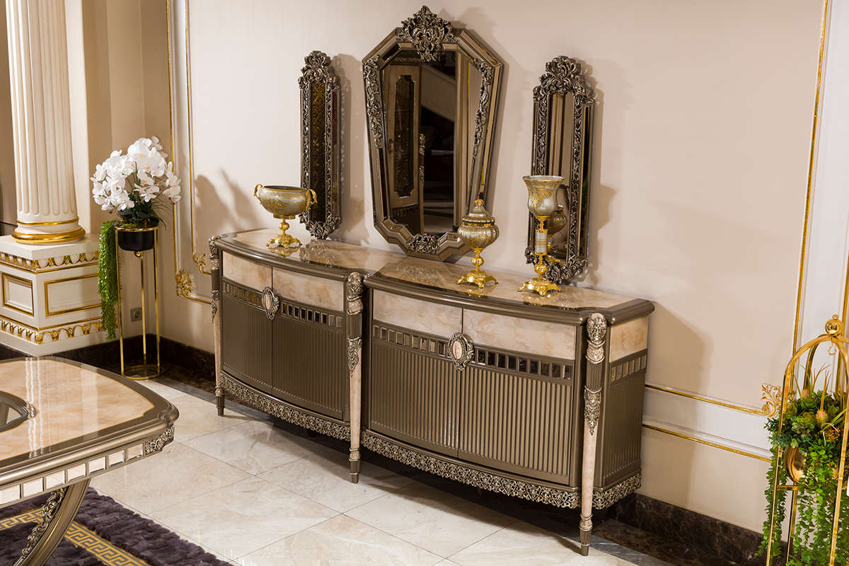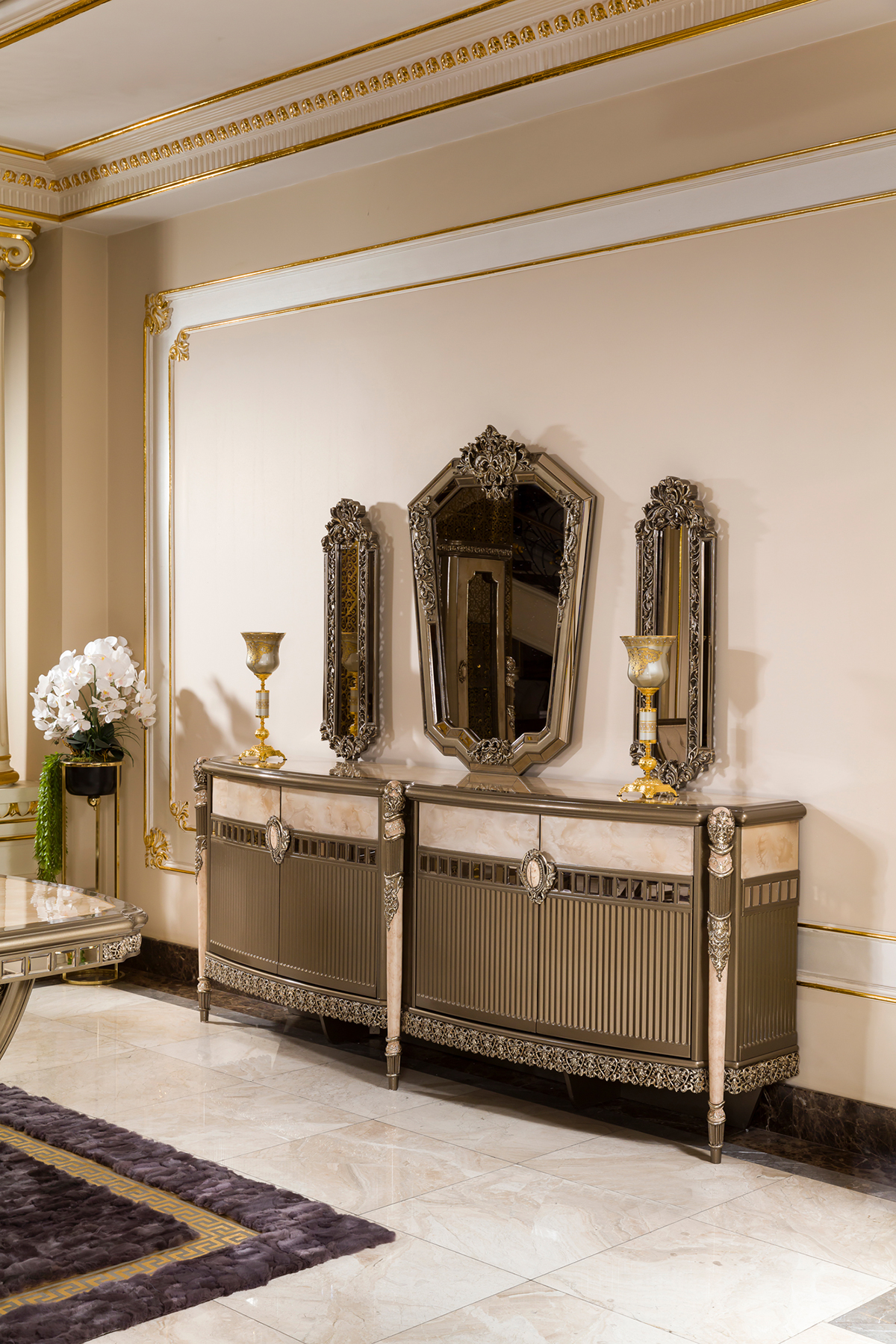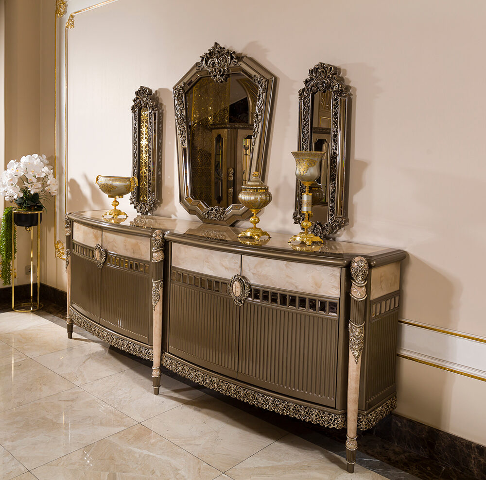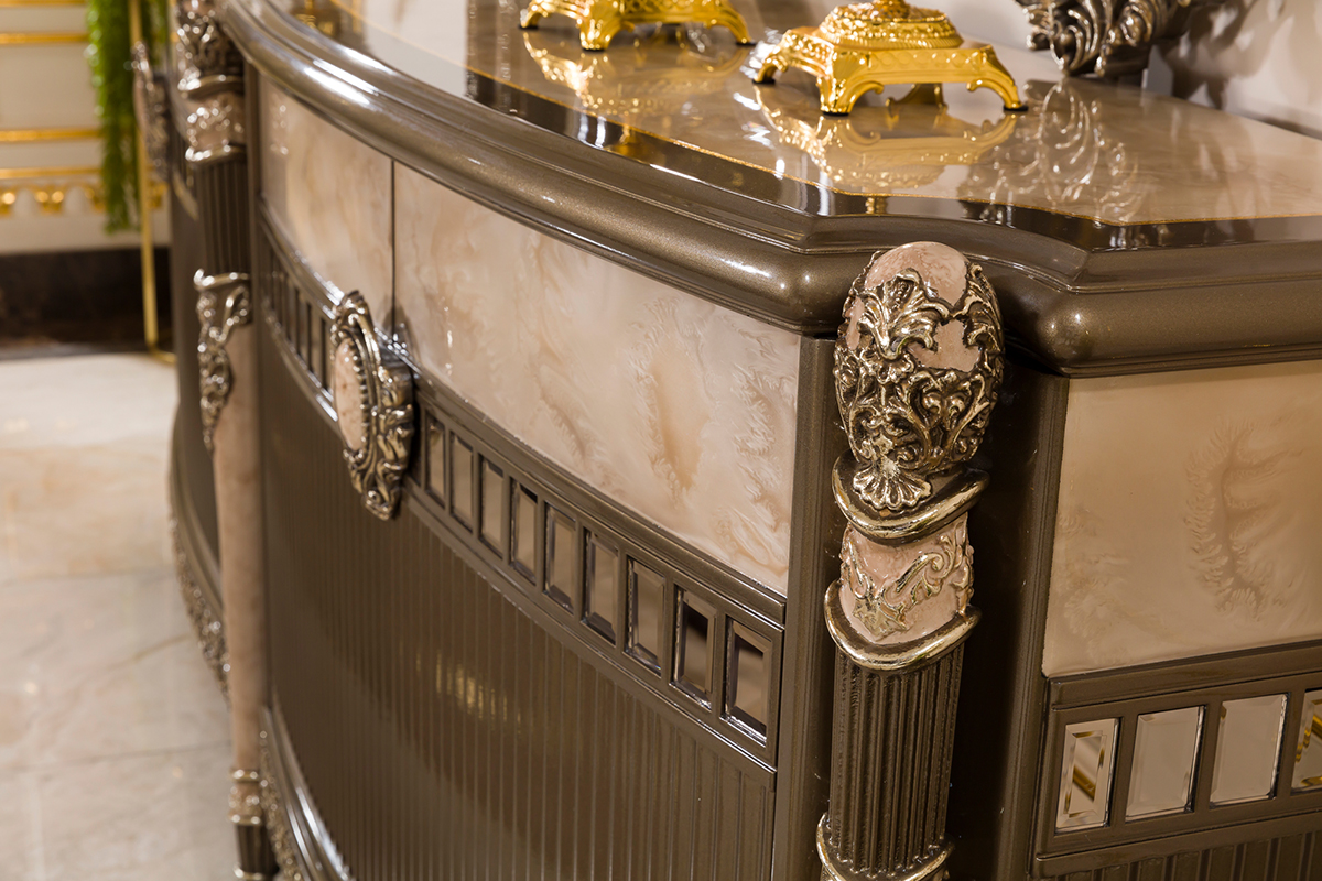 Designed by a Turkish custom furniture producer, the Perla Classic Console showcases expert craftsmanship, ornate carvings, and a luxurious finish. As part of a custom production, it offers both functionality and aesthetic appeal, creating a statement piece that enhances any living or dining space.