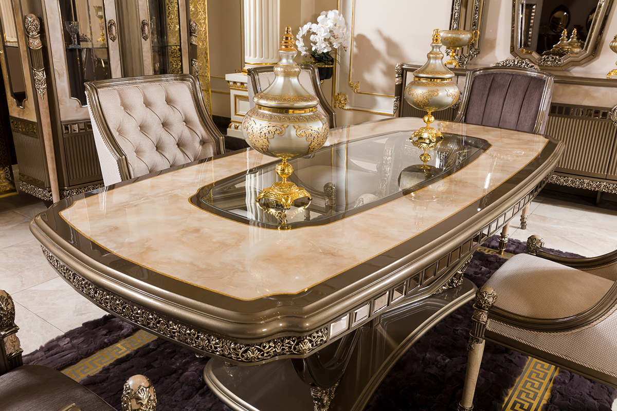 Designed by a Turkish custom furniture producer, the Perla Classic Table is a result of custom production, ensuring exceptional quality and durability. Whether for grand dining experiences or stylish gatherings, this table brings an air of prestige and sophistication to any setting.