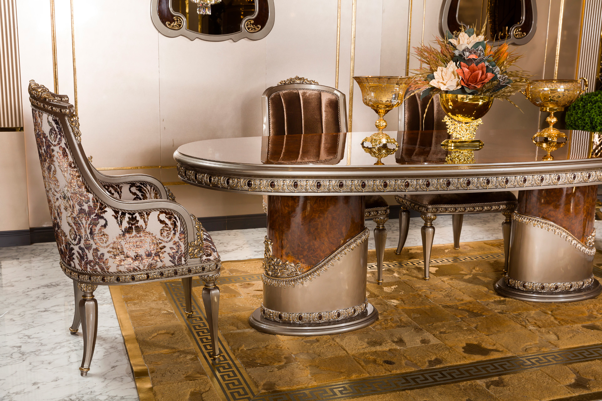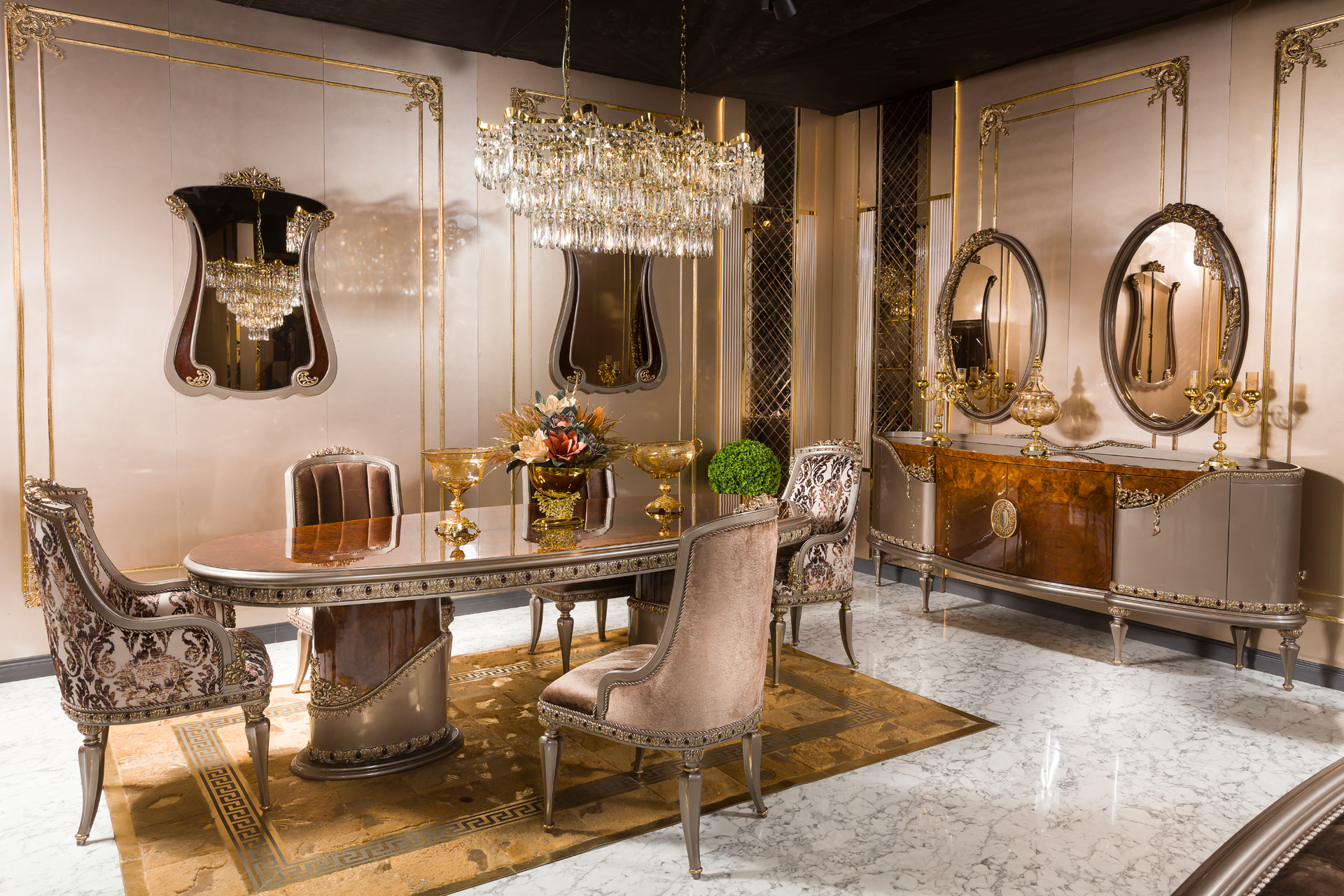 The Rolex Classic Dining Room is an exquisite representation of timeless luxury and master craftsmanship, produced by a custom Turkish furniture manufacturer. Made in Turkey, this dining room set is a perfect blend of traditional artistry and modern elegance, designed to elevate dining experiences with sophistication.
