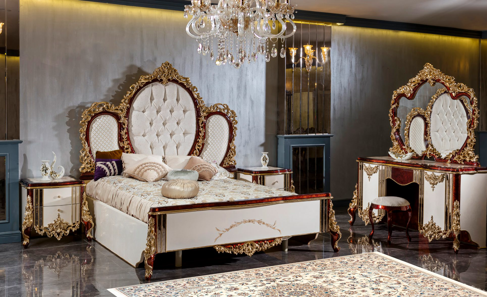 The Saltanat Classic Bedroom is a masterpiece of elegance, designed for those who appreciate luxury and craftsmanship. Produced with custom production techniques, this bedroom set is proudly Made in Turkey, showcasing the excellence of Turkish artisans. As a leading Turkish custom furniture producer, we pay attention to every intricate detail, ensuring a regal and timeless appeal. Our reputation as a Turkish custom furniture manufacturer guarantees premium quality, blending classic aesthetics with superior comfort. As a custom Turkish furniture manufacturer, we create exclusive designs that transform your bedroom into a palace of elegance and sophistication.